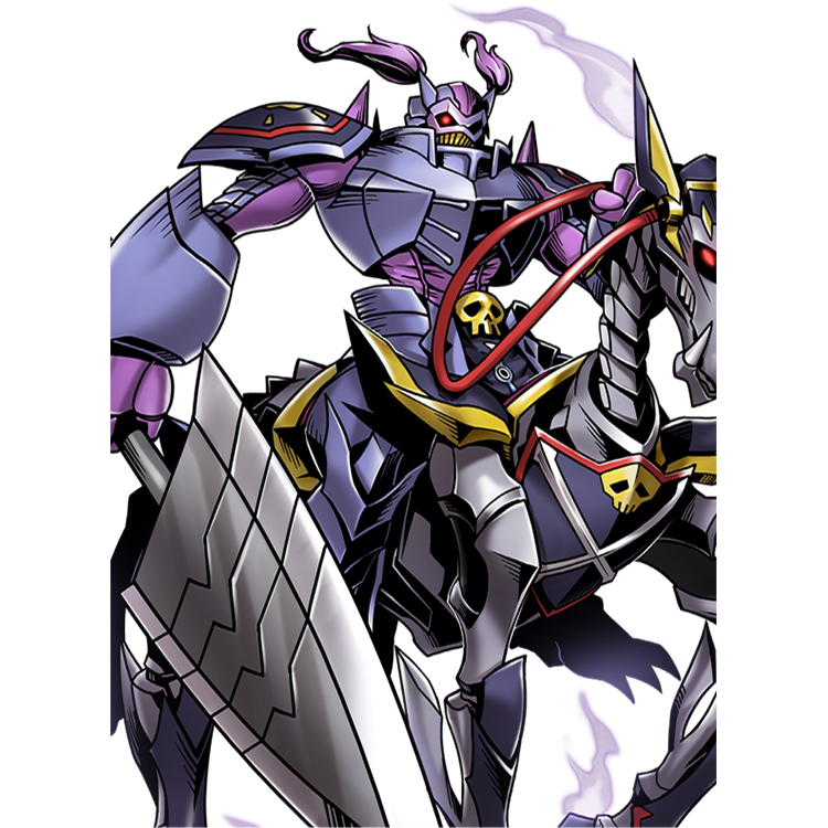 極少一部分的皇家騎士為了完成被交付的任務,有時會徵收位於派遣地點的數碼寶貝作為協助者。協助者的獲得方法根據任務情況各有不同,但據說顱骨獸會與認同為強者的數碼寶貝展開單挑,使對方屈服成為自己的部下,藉此獲得協助者。這個騎乘型態是顱骨獸在某個任務擊敗魔馬獸後,將對方徵收為坐騎的模樣。推測身為完美主義者的顱骨獸為了更有效率執行任務,因此看上了魔馬獸的機動能力。雙方雖然是不斷展開激烈戰鬥的關係,但在最後認同彼此實力,建立起堅定不移的信賴關係,並且獲得了強大的機動能力與攻擊力。必殺技是運用魔馬獸的全力奔馳,使用克拉烏・索拉斯發動衝鋒突刺「無情衝撞」。由於這個必殺技結合了魔馬獸最快的衝刺力、2 隻數碼寶貝的質量,以及顱骨獸的臂力,幾乎所有的數碼寶貝在接下這招突刺後會身體四分五裂消失得一乾二淨。另外,賜予魔馬獸騎乘者「絕不會死亡」的庇佑會對顱骨獸的魔盾「阿瓦隆」造成影響,僅限於騎乘時,全方位防禦「神之庇佑」的 3 秒限制時間會消失,能夠持續無效化所有攻擊。