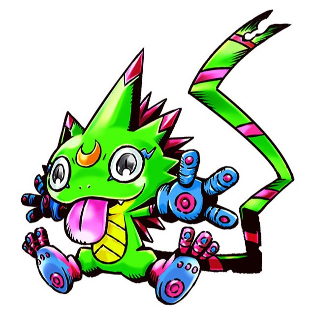 A vibrantly-colored Reptile Digimon that inhabits tropical rainforests throughout the Digital World. These bright colors act as camouflage allowing Gekkomon to blend in with its habitat, making spotting it difficult. The pads on its fingers and toes are capable of clinging to all kinds of surfaces, such as the trees or boulders on which it typically resides. Although personality varies from individual to individual, most are of an inquisitive and cheerful nature. Gekkomon's primary special move is Smash Beat, where it strikes foes with its freely-extendable tongue with a force that can even knock out Digimon stronger than itself if it lands a clean hit. It can also utilize its tongue to execute other creative attacks such as Break Throw, in which it grabs nearby objects with its tongue and hurls them at its opponent, or Swing Tackle, in which it uses its tongue to latch onto a nearby object before spinning itself around using centrifugal force to launch a body slam. When backed into a corner, Gekkomon has a tendency to cut off its own tail, which distracts foes while it escapes. Among members of the species, a shortened tail is regarded as a mark of cowardice, whereas a longer and unblemished tail is a sign of the owner's strength.