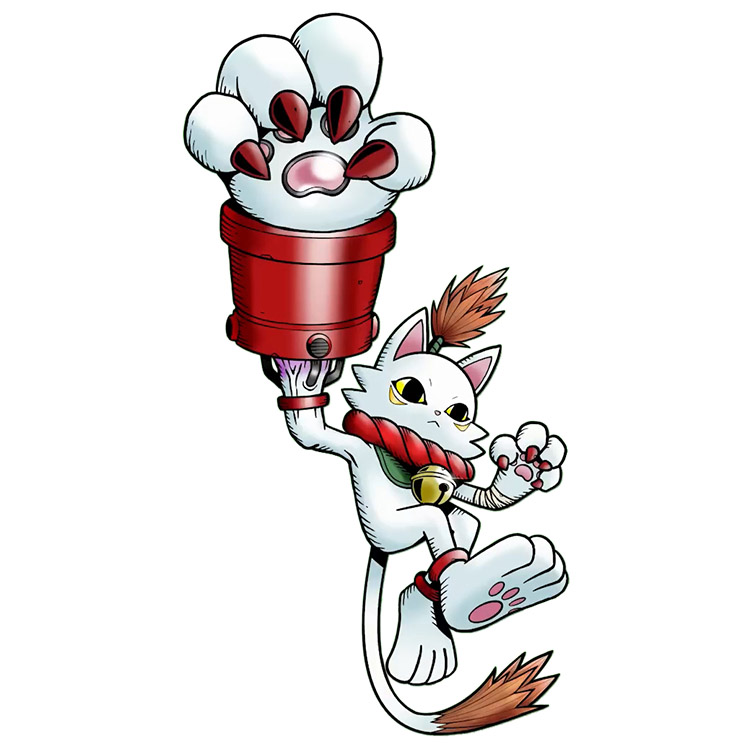 吸收了招財貓的相關數據的玩偶型數碼寶貝。雖然有著可愛的外表,但那巨大的右手卻能一擊打碎岩板。右掌的肉球是能吸引物體的裝置,並不是用於招來福氣,而是用來把敵人拉近以便攻擊。