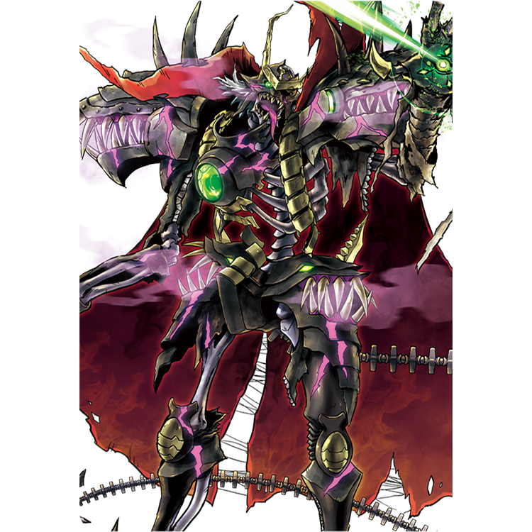 Plutomon's DigiCore has shut down due to reaching the end of its lifespan, but strangely, its body is still functioning. It no longer retains its core mission of defeating evil. It thinks of nothing but devouring the data of other beings, and endlessly wanders in search of new DigiCores. Unlike when it was alive, it is now a "terrible predator" in a completely different sense, as its decaying body will never know satisfaction, no matter how many DigiCores it consumes. Its special moves include Hell Slicer, which shoots out X particles from its left hand in order to cut the enemy to pieces, and Marionette Abomination, with which it bites enemies and infects them with a virus that turns them into a puppet forced to do its bidding.