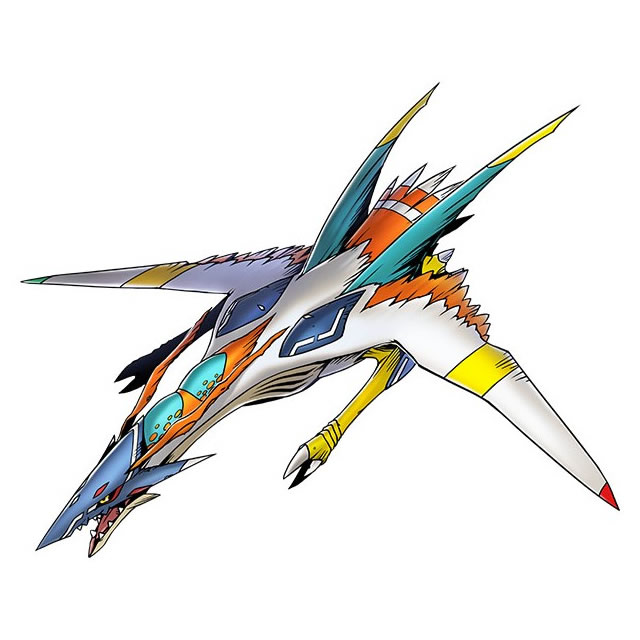A Beast Digimon with a unique shape, reminiscent of a fighter jet. Its appearance brings to mind Bird and Bird Dragon Digimon, but unlike most Bird Digimon, it is notable for its bone-hard wings that slice through the air and the jet engine-like organs which enable it to fly. It enjoys giving other Digimon rides in the cockpit-like organ on its neck, but as this requires getting in through its mouth, it often finds that they are not open to the idea.